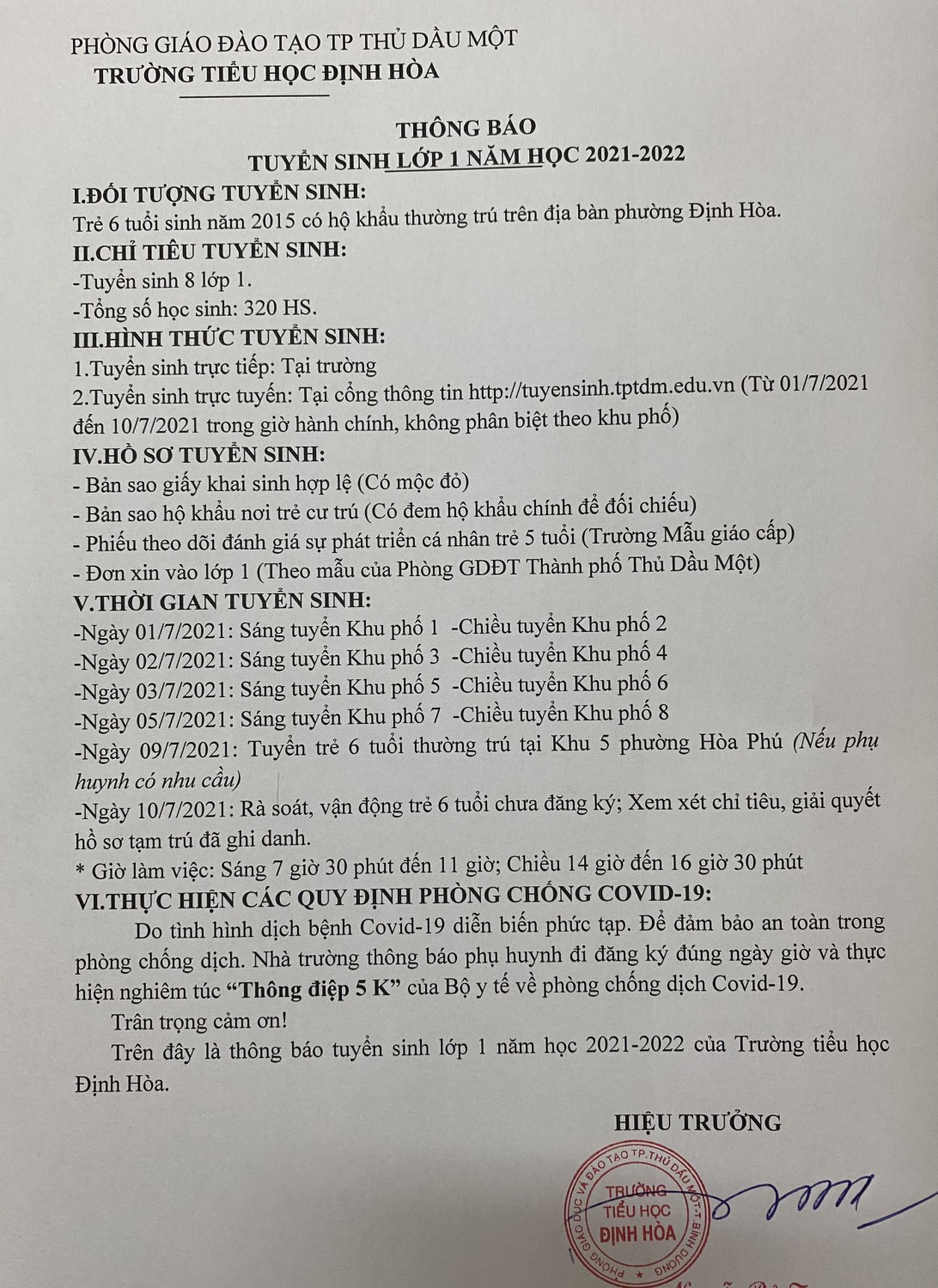 Trên đây là thông báo tuyển sinh lớp 1 năm học 2021 - 2022 của Trường tiểu học Định Hòa. HIỆU TRƯỞNG Xem Clip hướng dẫn: https://www.youtube.com/watch?v=2RibLC7wI_U